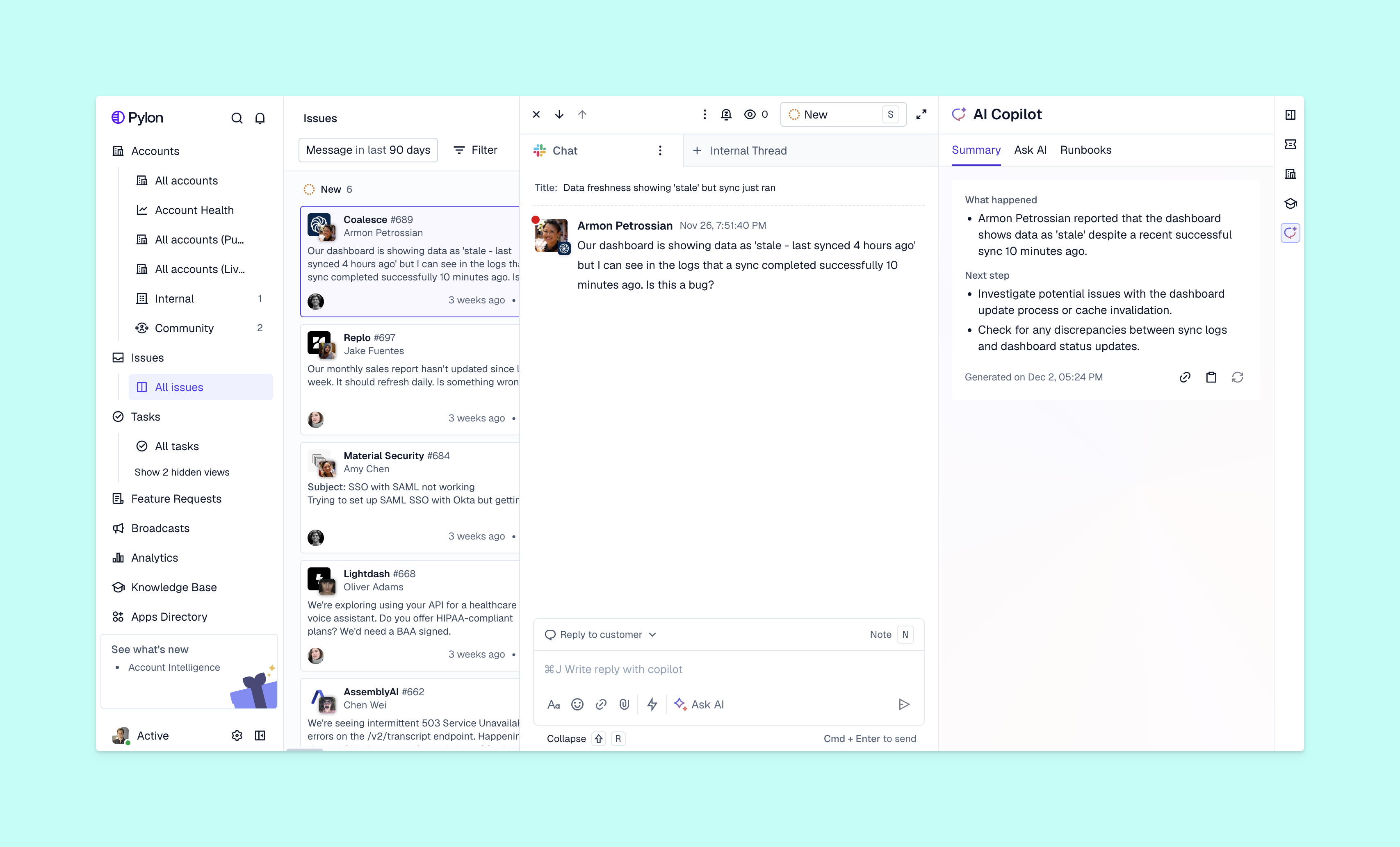 The best platforms also sync with other tools your organization uses — like your CRM or product ticketing system. And help desks like Pylon connect support data to customer success signals, so you have a complete 360 view of accounts.