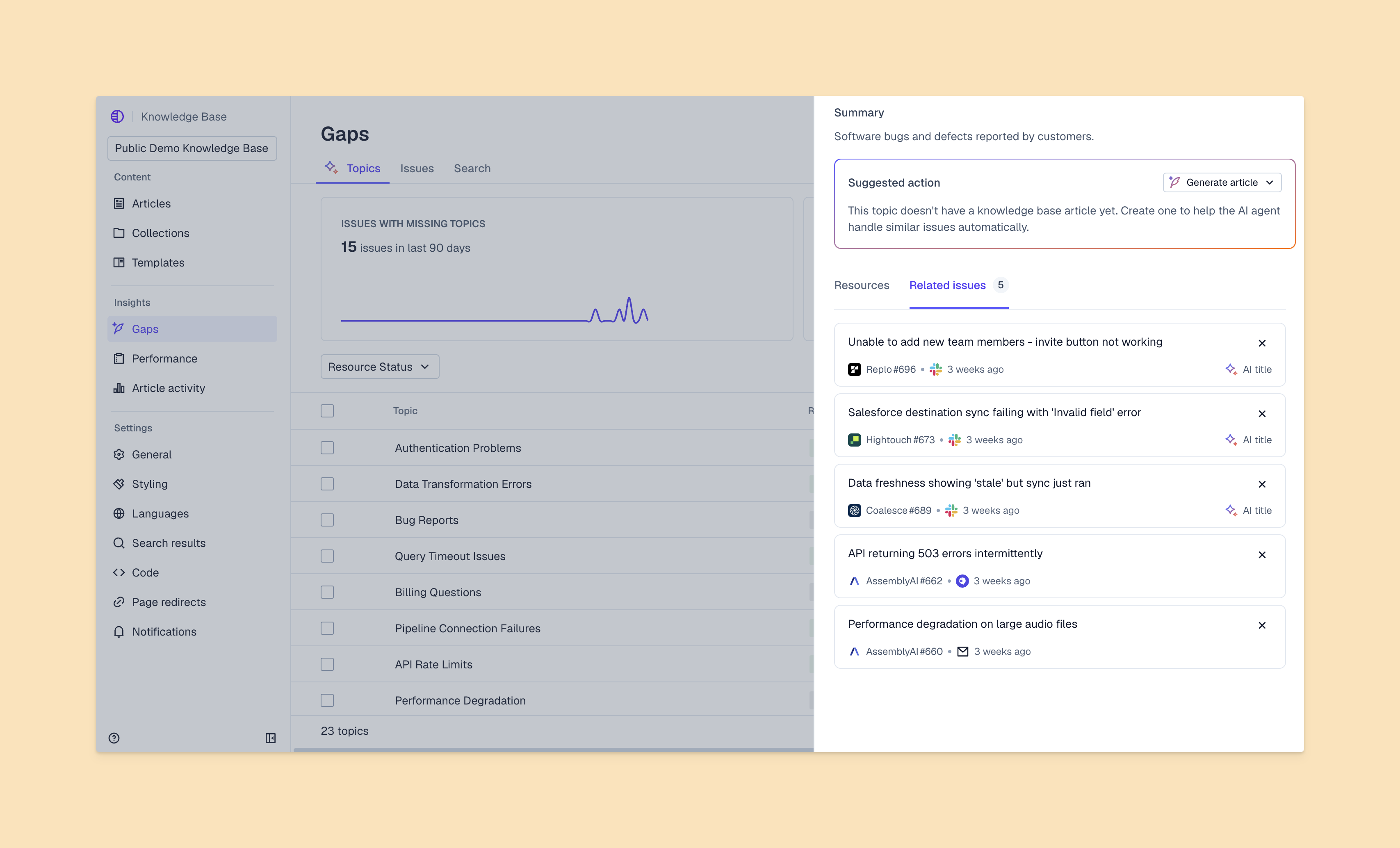 Plus, some knowledge management copilots can detect when you have duplicate content in your knowledge base, or gaps where a support topic hasn't been documented yet. This makes it much easier to keep your content up to date and helps your team expand the knowledge base based on actual customer needs.