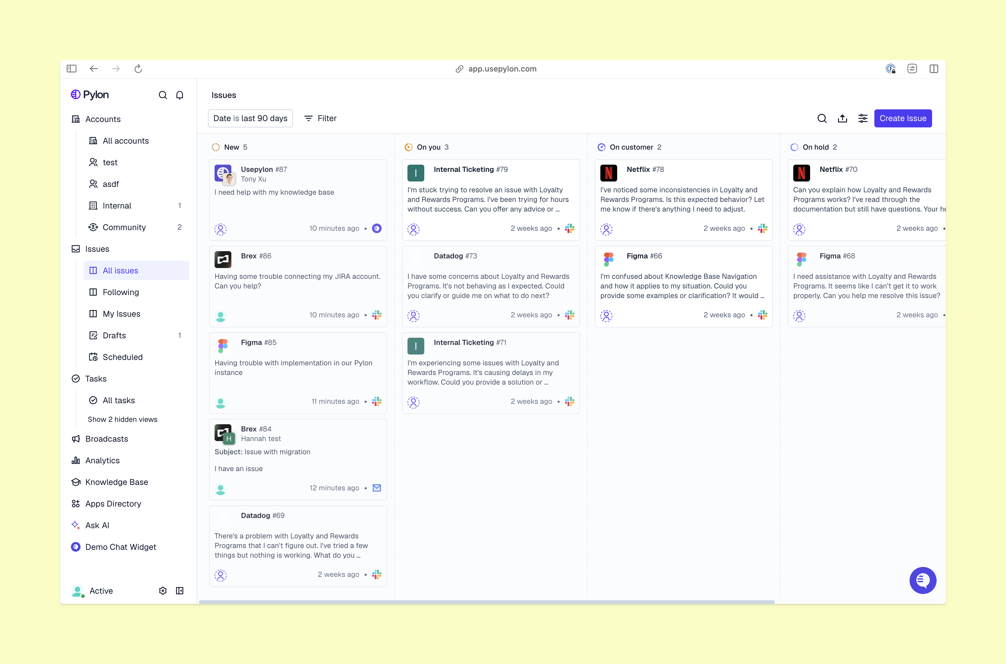 Pylon is the modern B2B support platform that offers true omnichannel support across Slack, Teams, email, chat, ticket forms, and more. Our AI Agents and Assistants automate busywork and reduce response times. Plus, with Account Intelligence that unifies scattered customer signals to calculate health scores and identify churn risk, we're built for customer success at scale.