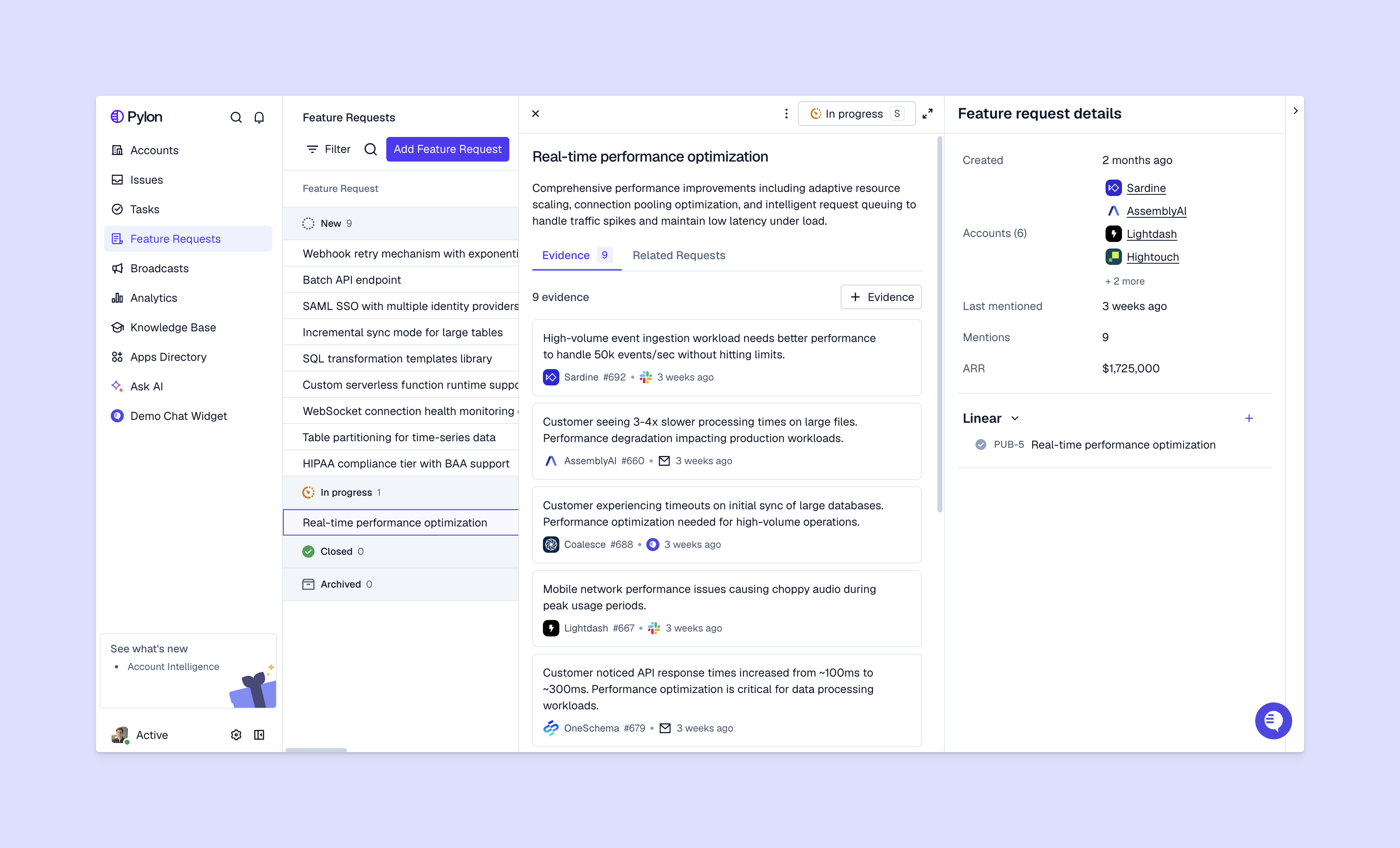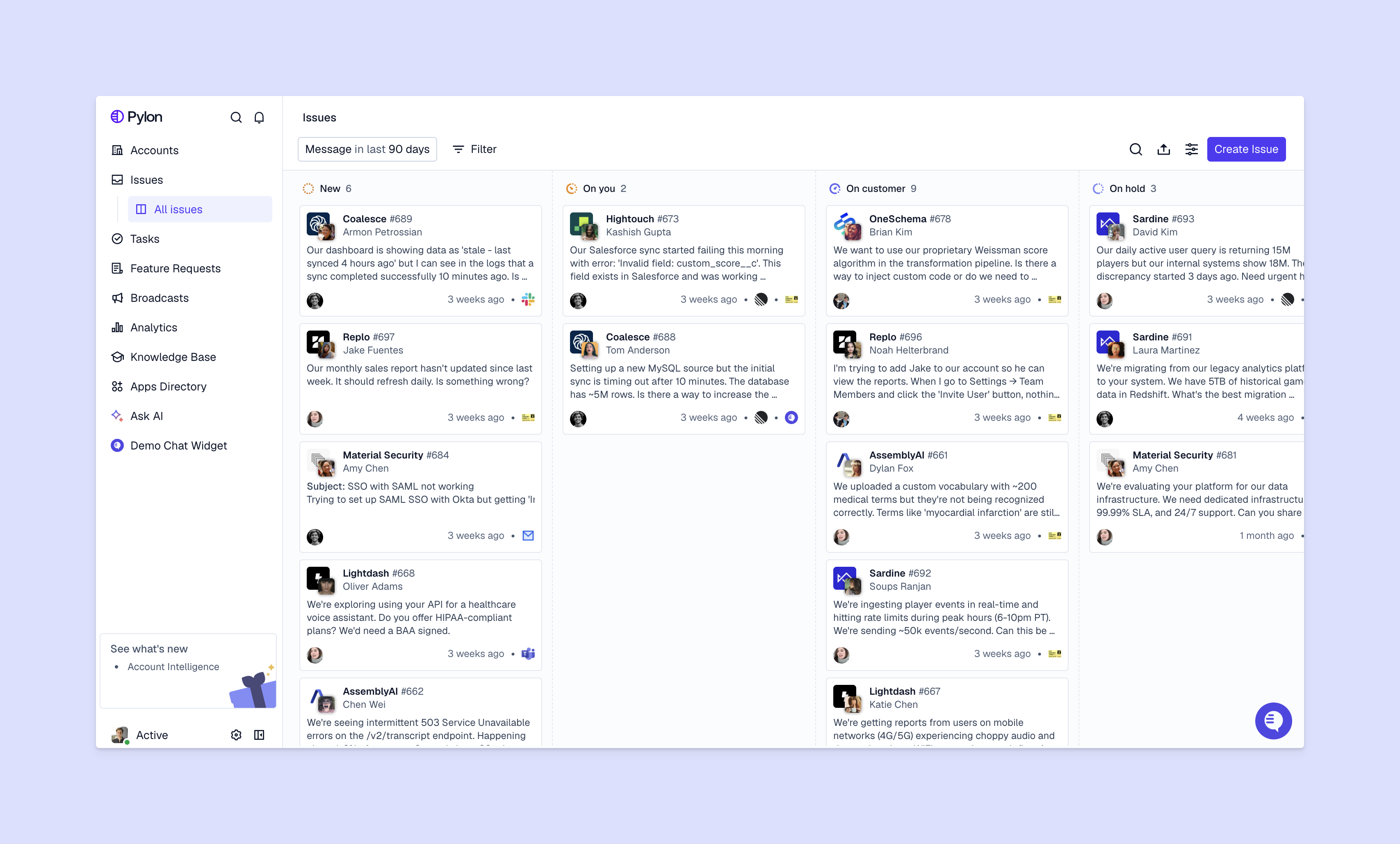 Pylon is the modern B2B support platform that offers true omnichannel support across Slack, Teams, email, chat, ticket forms, and more. Our AI Agents & Assistants automate busywork and reduce response times. Plus, with Account Intelligence that unifies scattered customer signals to calculate health scores and identify churn risk, we're built for customer success at scale.