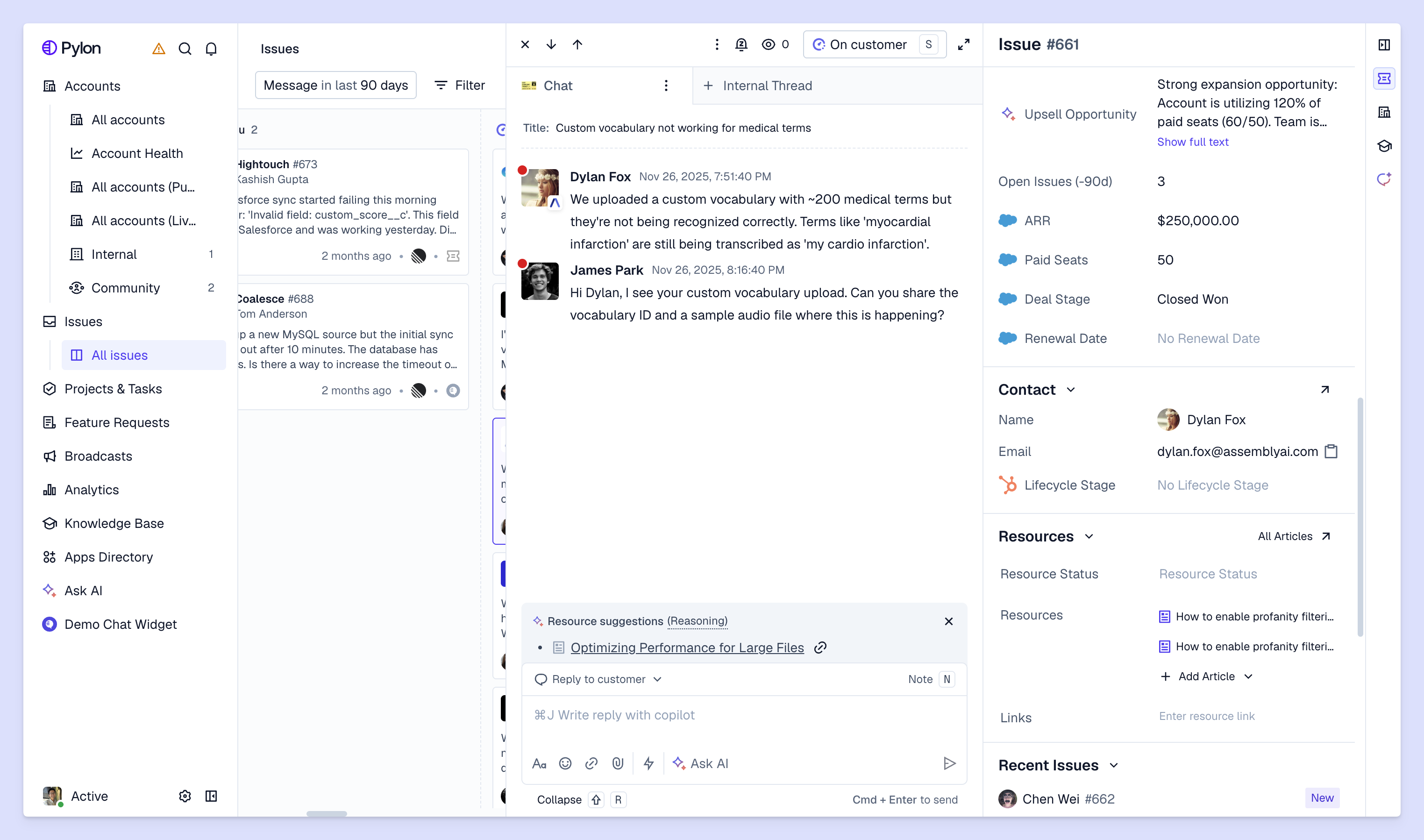 Pylon is the modern B2B support platform that offers true omnichannel support across Slack, Teams, email, chat, ticket forms, and more. Our AI Agents & Assistants automate busywork and reduce response times. Plus, with Account Intelligence that unifies scattered customer signals to calculate health scores and identify churn risk, we're built for customer success at scale.