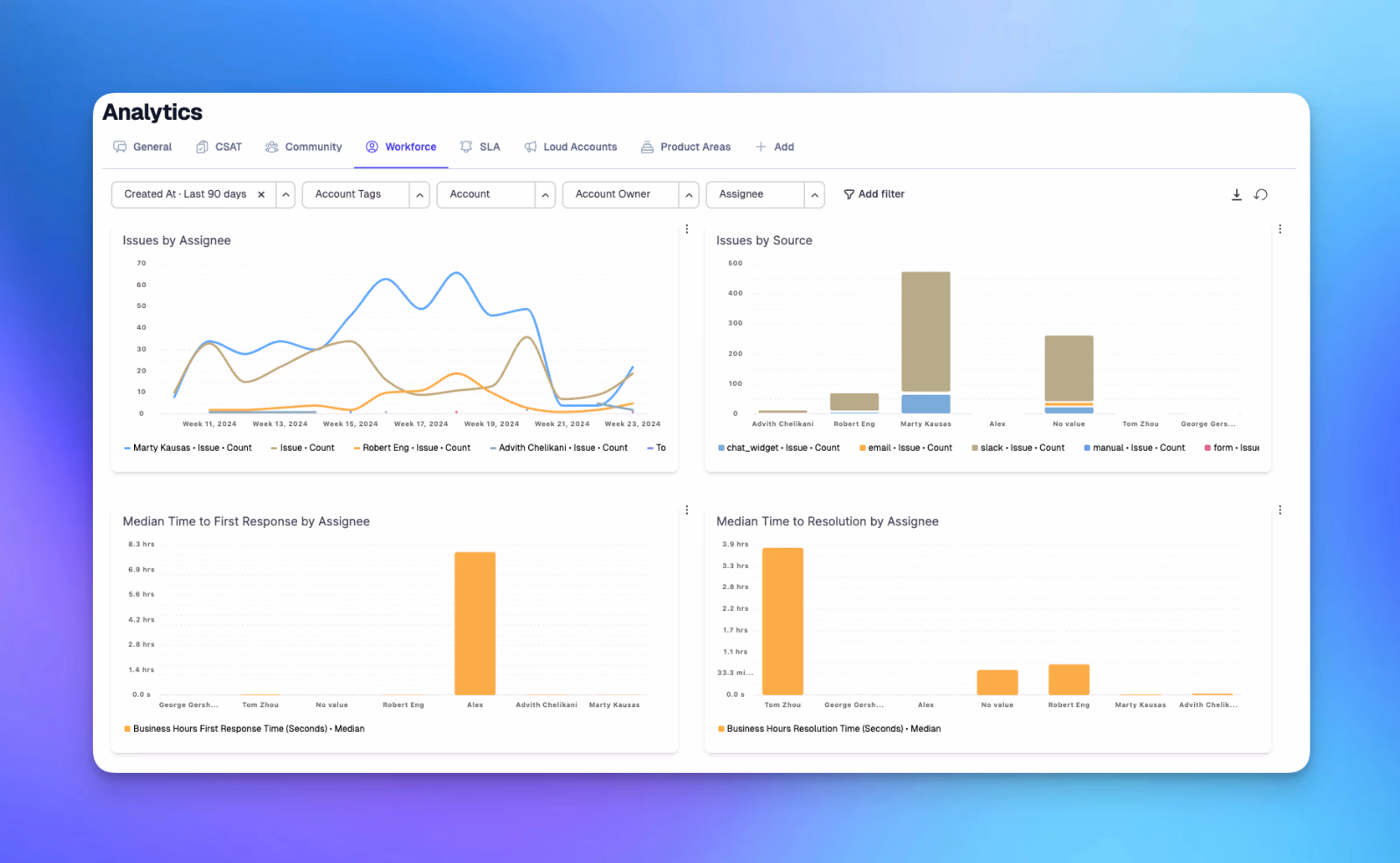 Create new pinned views with a curated set of graphs with specific visibility settings - make a dashboard for leadership on high level metrics, a dashboard for your product team on bug volume by product area, and more.