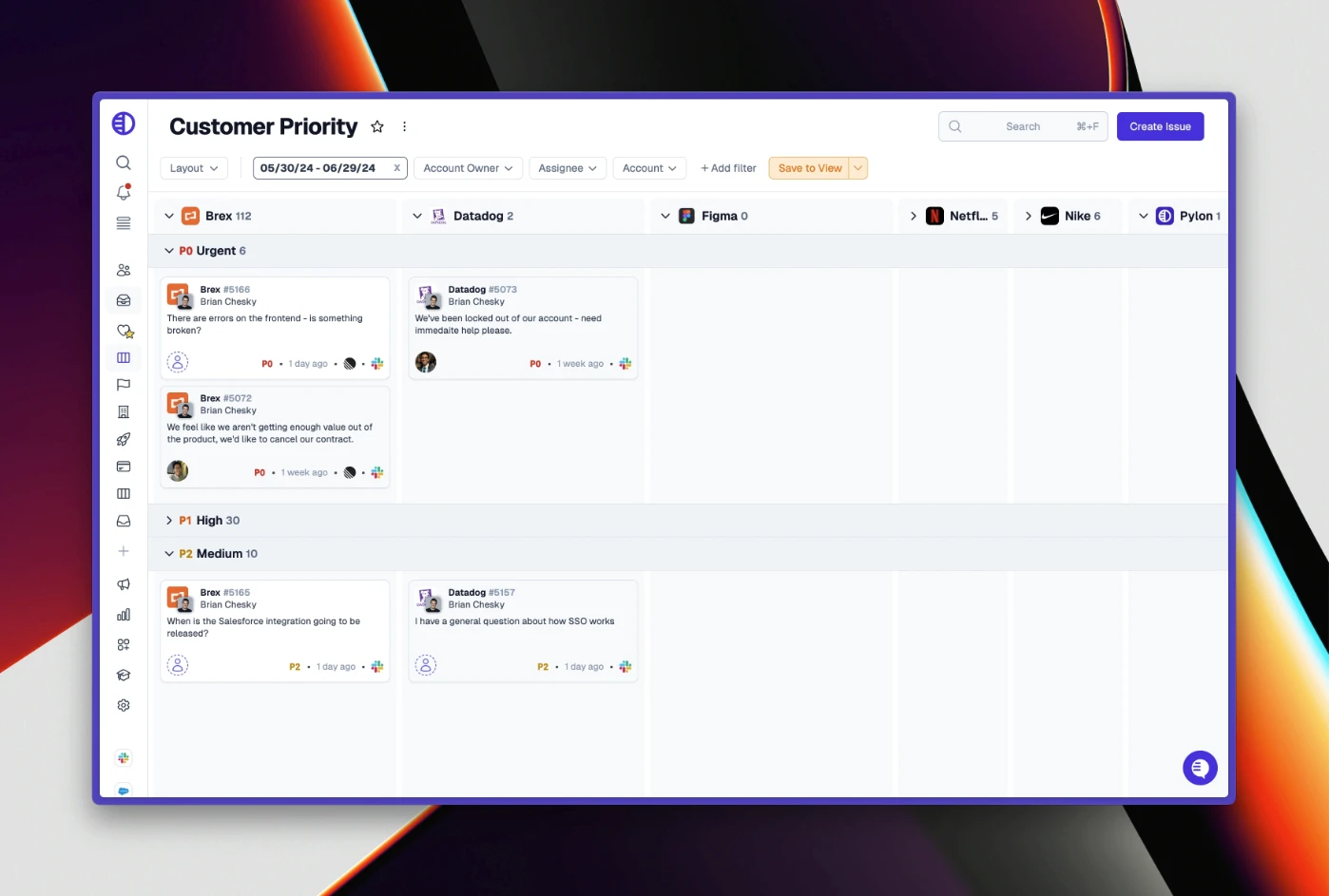 Custom Layouts is a game changer for B2B support, success, and account management teams.You can now shuffle around columns, grouping, and sorting dimensions to visualize and take action on customer issues in a way that exactly fits your workflow.