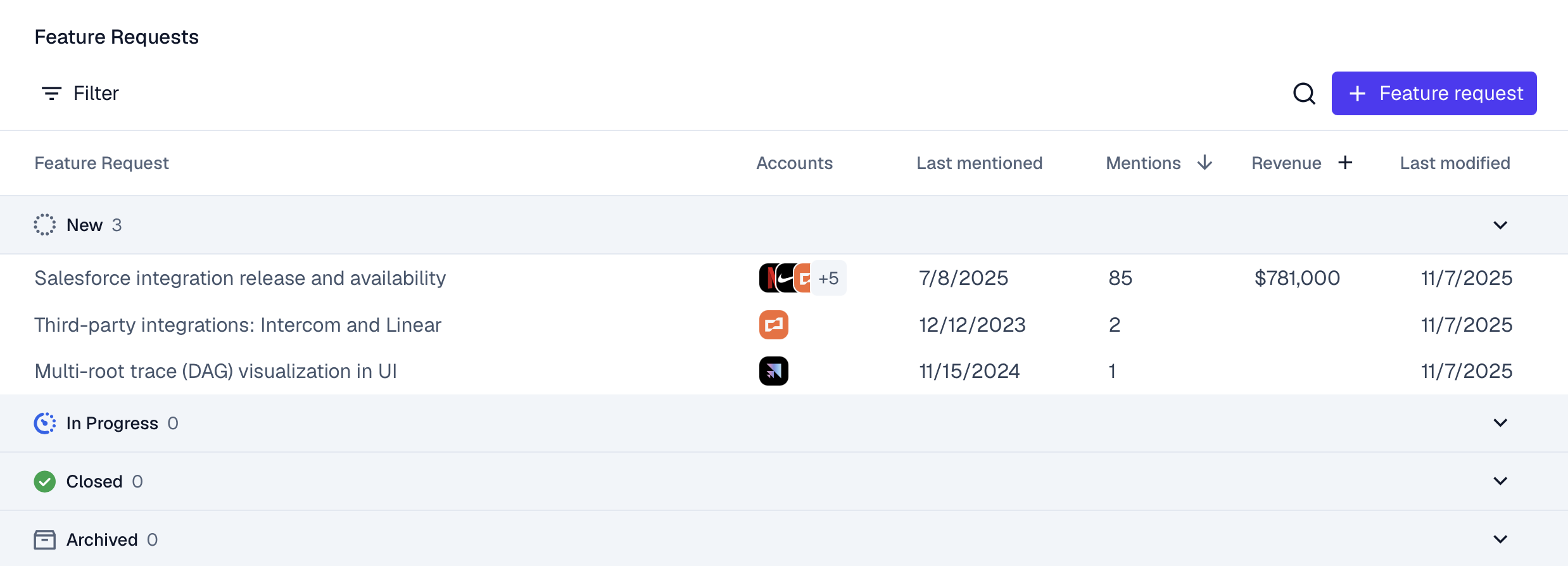 Automatically analyzes all customer interactions to extract and organize customer feedback into clear feature requests for your teams